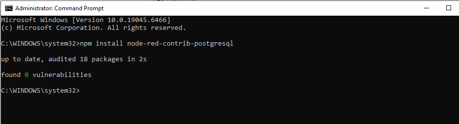 Take an admin command prompt and run the following command. A PostgreSQL node is needed if we want to save data to the PostgreSQL server. It can run in an admin command window.