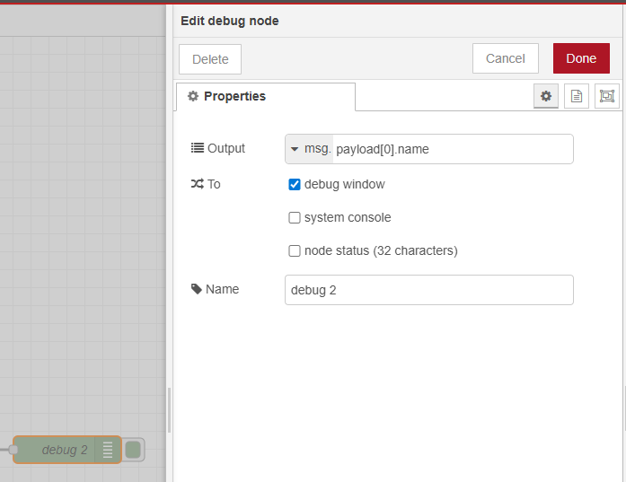 }We shall format the data with the help of the function node and send those data to debug node. Since this is our first example, we shall display the street name in the debug window. We have renamed the following from the default names.