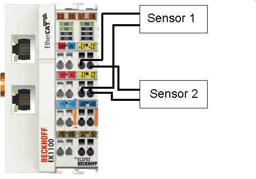 Figure 01: EtherCAT coupler with 2 RJ45 port + 2 Sensor connected to EL3702 terminal card