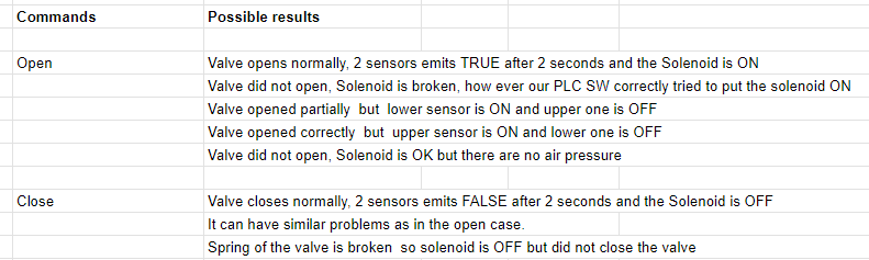 We shall develop our test system without any physical valves, when our SW is tested then we just activate our program to the PLC then we are done! Following diagram shows possible commands and related results, we can develop similar cases based on our devices and process.