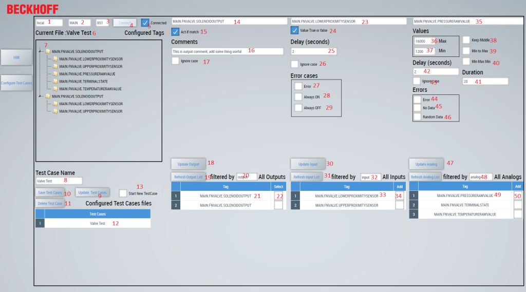 When we are testing our software, we must select a test case file (from the configuration page) and the test sw should be connected to the PLC.
