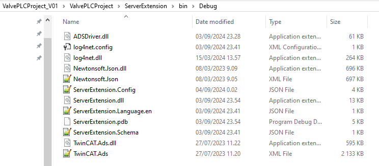 After unzipping the project you get the following files in the folder ValvePLCProject\ServerExtension\bin\Debug